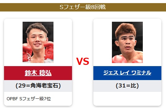 【専門サイト解説から】 OPBF東洋太平洋Sフェザー級7位の鈴木は、強烈な左ボディと左フックを武器にするバランスの良い右ボクサーファイター。ベテランのワミナルを倒し、ランキング上昇と飛躍につなげたいところだ。主導権を握れるかが勝負の分かれ目となる。